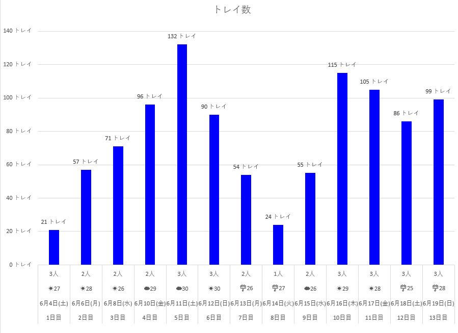 | 13日目 | 6月19日(日) | ☔28 | 3人 | 99 トレイ | 2,376 ポット |