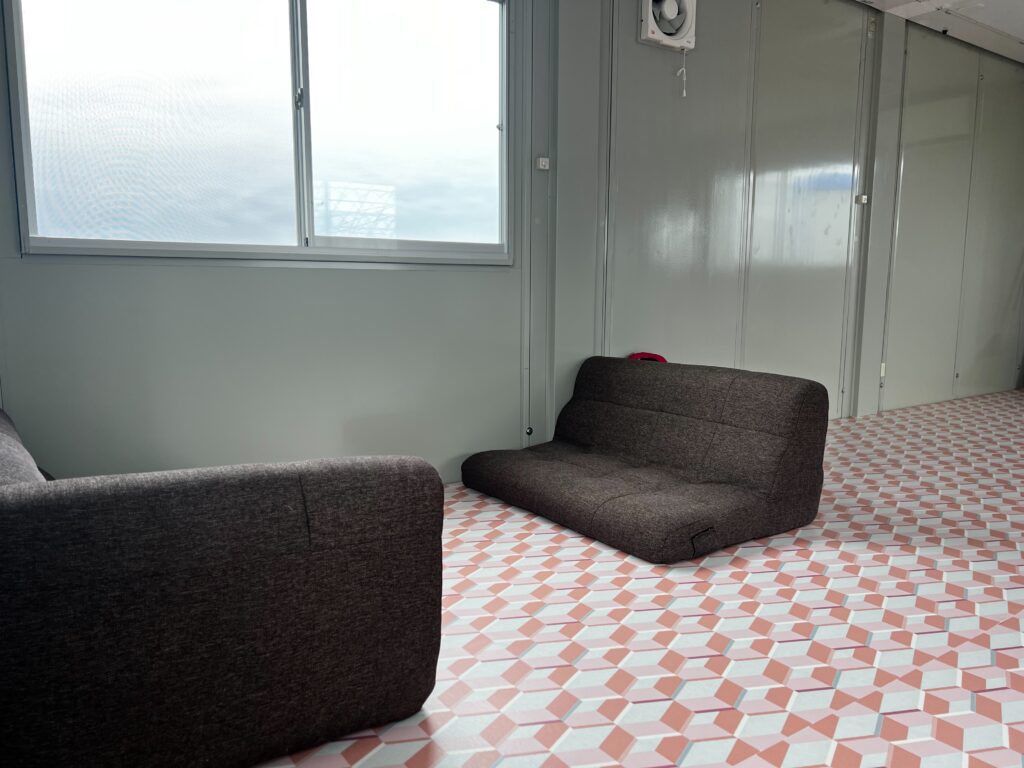 明るいプレハブにしたいとの思いから、ピンクのフロアマットを入れてみました。